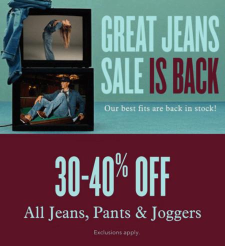 The Great Jeans Sale is back! Shop in store and get 30-40% off all jeans, pants, and joggers.