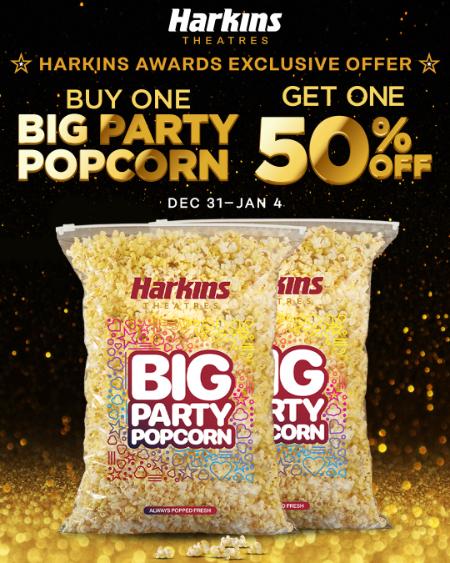 Through January 4, Harkins Awards Members can buy one Big Party Popcorn and get one 50% OFF!