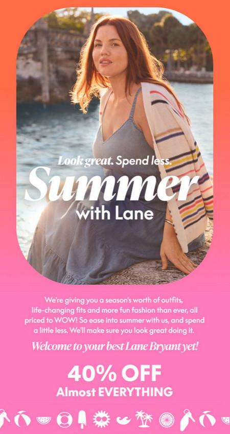 Valid in Lane Bryant stores 4/20/2026 through 4/25/2026. Offer valid on as marked in-stock clothing, sleep & swim. Excludes early access, panties, clearance and third-party brands (e.g., Skechers, Clarks & Lemon). Not combinable with coupons or other discounts unless otherwise stated.